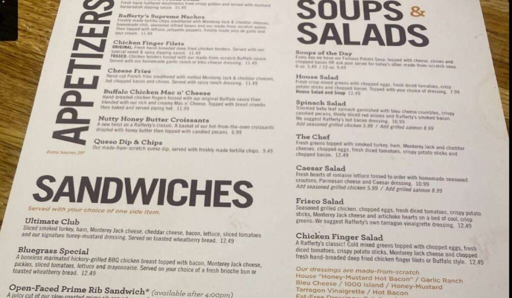 - Next up, dive into the incredible selection of soups and salads that are guaranteed to satisfy even the pickiest of eaters. Whether you’re in the mood for a hearty bowl of chili or a fresh and crisp garden salad, Rafferty’s has got you covered.