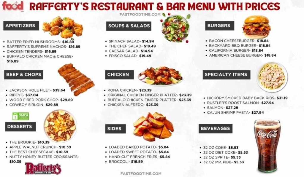 From savory appetizers to decadent desserts, every dish on our menu is prepared with the finest ingredients and utmost attention to detail. Whether you’re in the mood for a classic favorite or eager to try something new and exciting, Rafferty’s menu has got you covered.